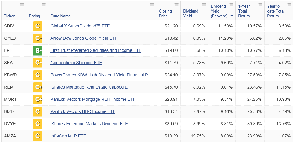 The Global X SuperDividend ETF (SDIV, Rated “C”) came in first place. The $895 million ETF invests in a basket of higher-yielding, foreign and domestic stocks. That includes mortgage insurers, banks, REITs, shipping firms, and more. It sports a dividend yield of around 6.7%.