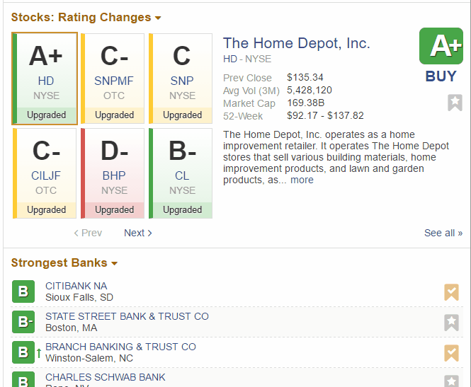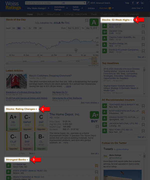 There are three widgets you can customize, and they are titled “Stocks: 52-Week Highs” (arrow 1), “Stocks: Rating Changes” (arrow 2), and “Strongest Banks” (arrow 3).