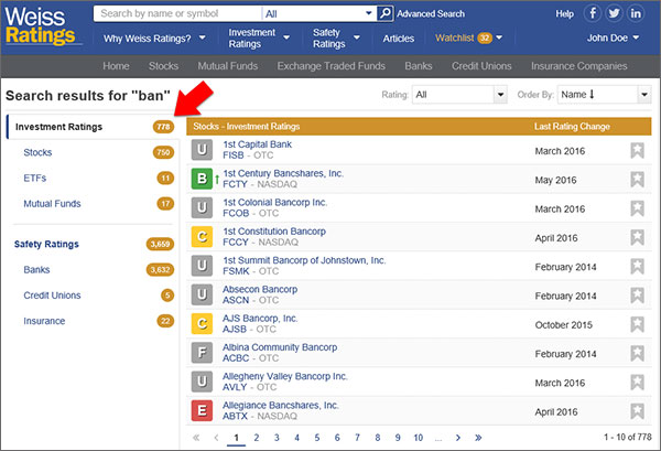 That’s because—with over 53,000 ratings in Weiss Ratings--many of the companies we rate have similar names (apparently everyone wants to be “First” or let you know they are “National”), or they may be listed under several industries in both Investment Ratings and Safety Ratings. So, when you type in our search box, you’ll notice something a little different…