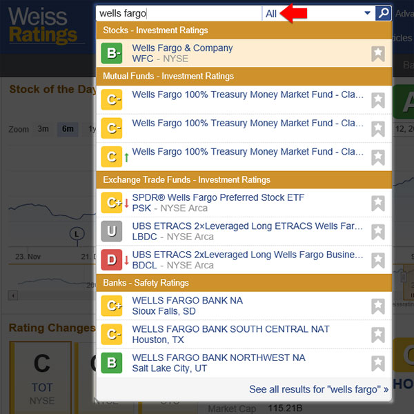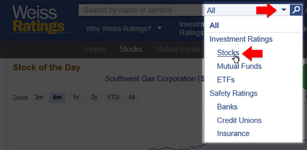 But if you want to narrow your results even faster, you can use the dropdown menu, select “stocks” for example, and zero in on the precise rating you were searching for.