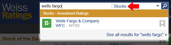 But if you want a more precise search, in a specific industry, all you need to do is click the word All, and you’ll see a dropdown menu with every industry we rate. Select the one you want to search under (“Stocks” in the example below), and now when you search, you’ll only see results within that industry.