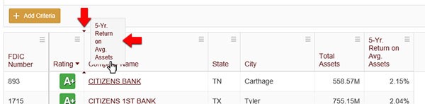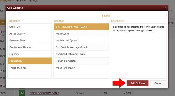 For this example, we’ll select “Profitability” from the Categories, then “5-Yr. Return on Avg. Assets” from the choice of Columns, then click the red Add Column button to add that data.
