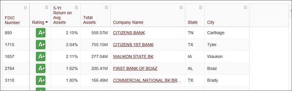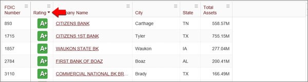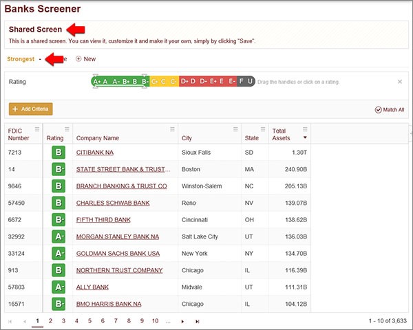 For this example, we are going to use a Bank Screener that is always available on the main Bank Safety Ratings page.