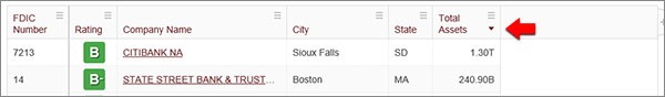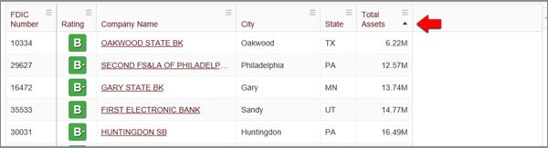 To change the order from descending to ascending, all you need to do is click the arrow and the results will now display the bank with the lowest Total Assets at the top.